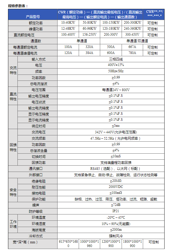 CWDZ系列回饋式直流電子負載采用DC/DC式控制技術加PWM逆變技術,和雙DSP控制核心,能實現(xiàn)高性能全功率段能量回饋電網(wǎng)功能,相比常規(guī)直流負載,更節(jié)能,更綠色環(huán)保。數(shù)字控制技術,高控制精度,響應速度快,負載電壓范圍寬,可實現(xiàn)24V至滿量程電壓的全范圍負載輸入。