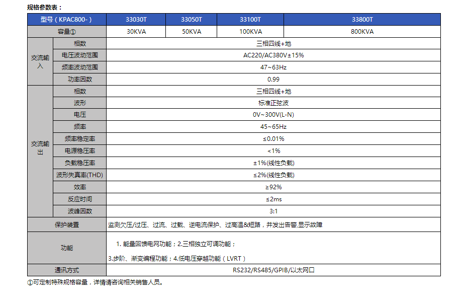 KPAC800系列具備能量回饋功能,可將能量回饋至電網(wǎng),節(jié)省能源及降低整體的購置成本。內(nèi)建的低電壓穿越功能(LVRT),用戶可以輕松模擬各法規(guī)的相關(guān)電壓跌落曲線,通過步階、漸變的編程功能可設(shè)定連續(xù)或階段式的電壓及頻率變動。三相獨立可調(diào)功能可獨立調(diào)整各相的電壓,適用于多臺單相負(fù)載相位可調(diào)功能,可設(shè)定三相之間相位角度。